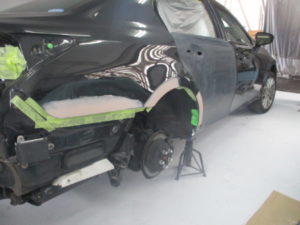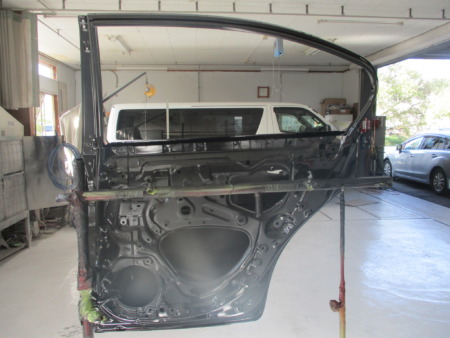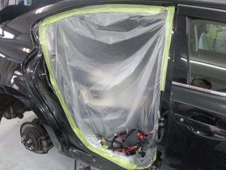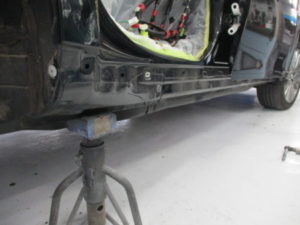 リアドア、リアバンパー、サイドシルガーニッシュを脱着してアウターパネルの鈑金作業に入ります。