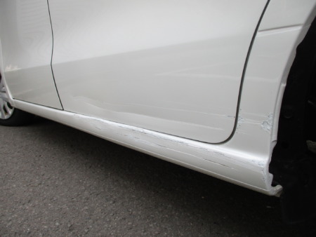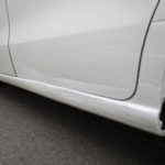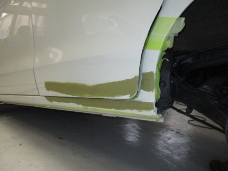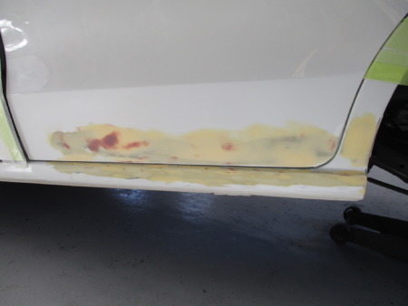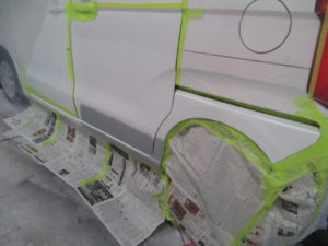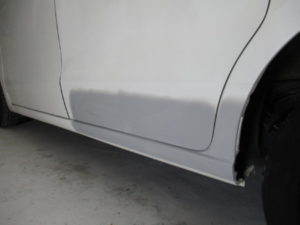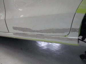 スライドドア下、サイドパネルに大きくヘコミ、ガリキズがあります。ベルトサンダーで削りある程度引っ張り出しパテを塗り形を整えていきます。