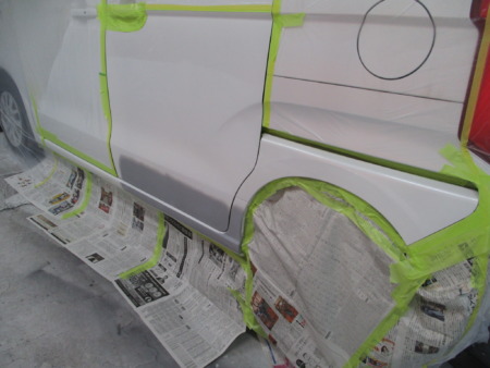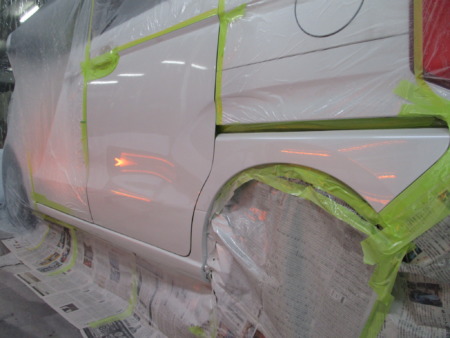 塗装部分を足付けして塗装ブースに移動してマスキングが終わったら塗装開始です。